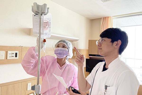 東棟14階病棟に入院される患者さんの主な疾患は、白血病・悪性リンパ腫・多発性骨髄腫などです。治療内容としては大量化学療法や造血幹細胞移植・輸血療法が主な治療となります。病棟すべてが無菌病棟(手術室と同等の空調設備を備えた管理)で、易感染状態の患者さんが治療しながら日常生活を安心して送れるようになっています。看護内容は化学療法看護、移植看護、感染予防などが主な内容となります。他職種との連携では、作業療法士や理学療法士と共にがんリハビリテーションを積極的に取り入れ筋力低下を予防し、NSTとの連携では患者さんの食事・栄養状態の改善や維持に務めています。また、歯科衛生士と共に口腔ケアにも力を入れ、患者さんの感染予防指導を行っています。私たちは、常に患者さんに寄り添い、やさしさを持って看護にあたり、患者さんが安心して治療を受けられ、1日も早く退院できるよう頑張っています。